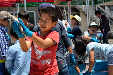 元気に跳ね回る魚たちに水をかけられるたび笑顔をはじけさせて夢中で触れ合う子供達。