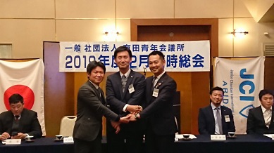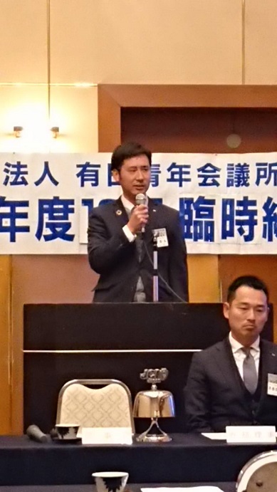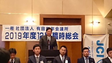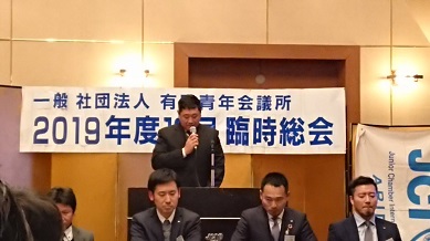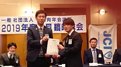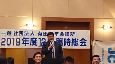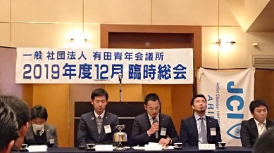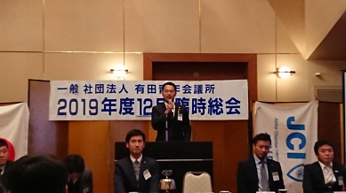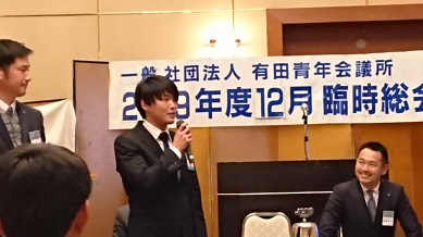 2019年 12月26日(土) 2019年度 12月定例会 場所:橘家 定例会当日の様子 総会の様子。 理事長挨拶 理事長バッチを酒井君から岡田君へ。(左) 直前理事長バッチを佐々木君から酒井君へ。(右) 新旧理事長、直前理事長 2020年度理事長の岡田浩儀君の挨拶 新入会員 新たに正会員となった箱﨑太輔君 地域や自己の成長を目指して共にがんばりましょう。 特別会員を代表して加納先輩より一言いただきました。 監事講評 慈幸監事(左)。北畑監事(右)