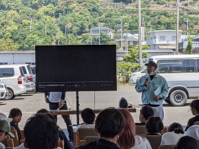 ビデオ鑑賞の様子 説明をする(株)則種海産の植田さん