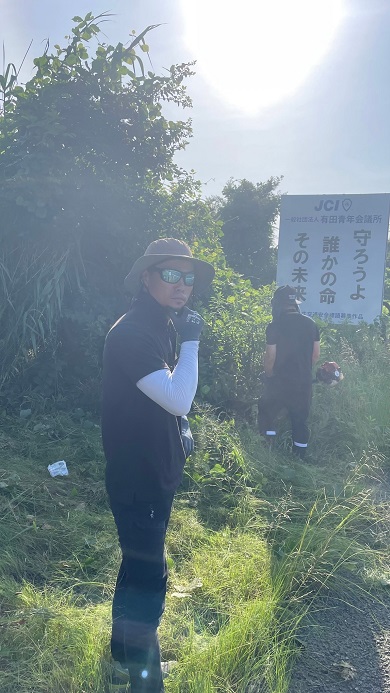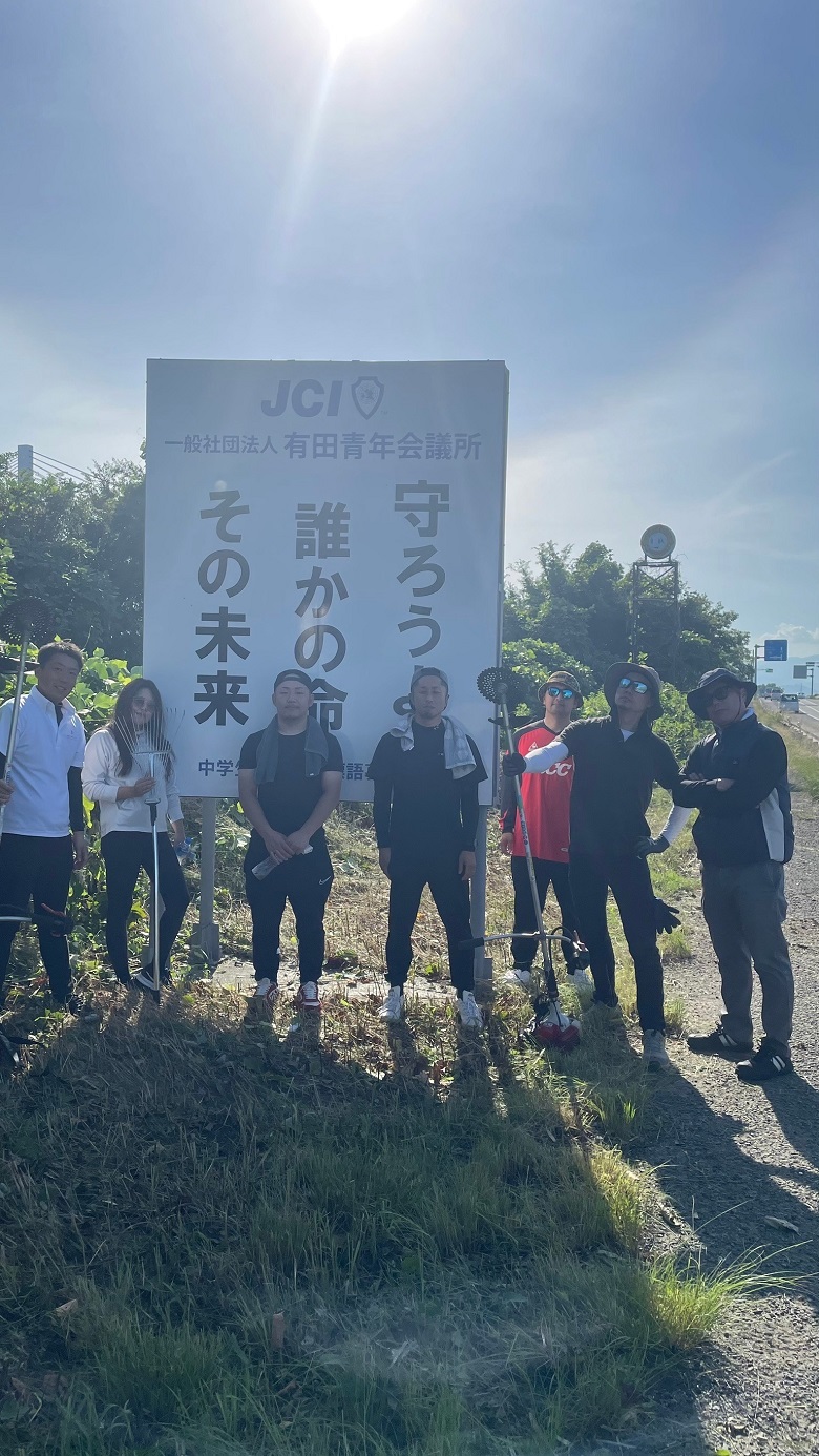 2024年 7月7日(日) 上記日程にて有田川クリーン作戦を行いました。 場所:有田市辻堂、有田JC看板周辺 集合写真 熱い中参加してくれたメンバーの皆さんお疲れ様でした!早朝とはいえ日差しがきつく、厳しい作業であったことは想像に難くありません。おかげで車で通っても看板がよく見えるようになりました。
